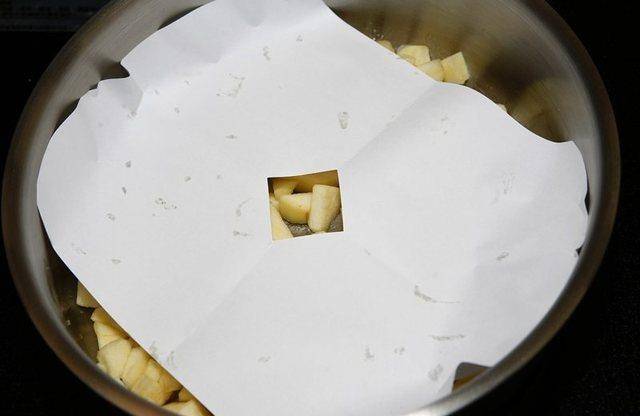 Tips:苹果若是不加盖炒,会外软而内硬,使用白报纸而不使用锅盖,是因为白报纸会吸收水气,且剪了洞后,也会加速水汽蒸散;若使用锅盖,则水气会在锅中循环,苹果里的水分散得慢。