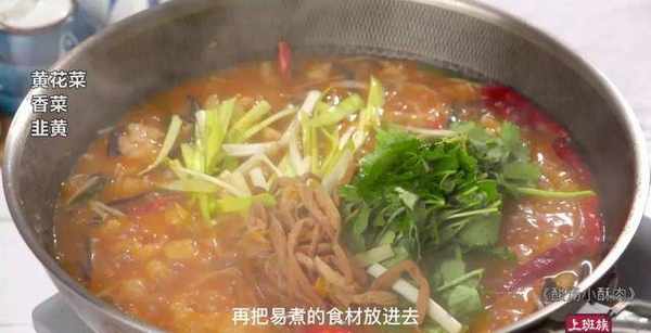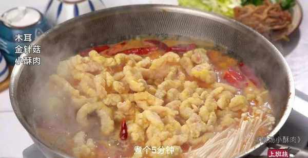 再把耐煮的食材和小酥肉一起丢进去煮个五分钟,可以买现成的小酥肉,或者看我往期的小酥肉视频。