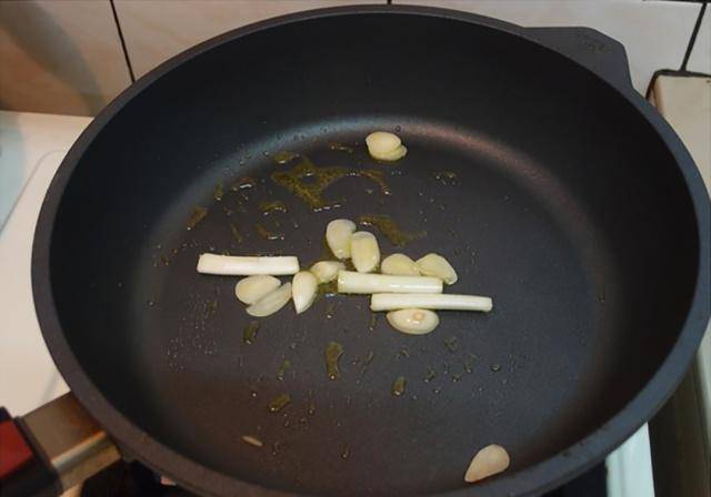 4.用小火爆香蒜片、葱白。