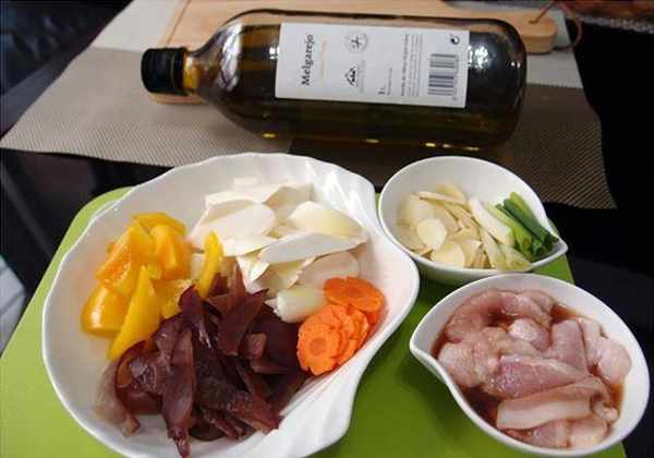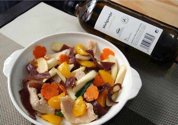 3.冷锅放入冷压初榨橄榄油。