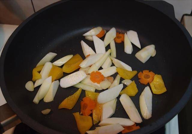 5.接着放入茭白笋、红萝卜、黄甜椒拌炒,并加入适当的水煨煮。