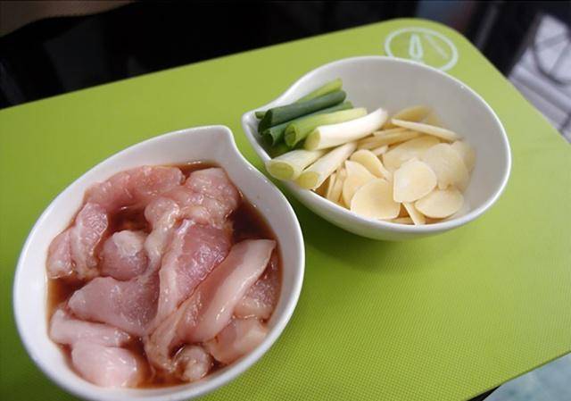 2.大蒜切片,葱切断,猪肉片用腌料腌五分钟。