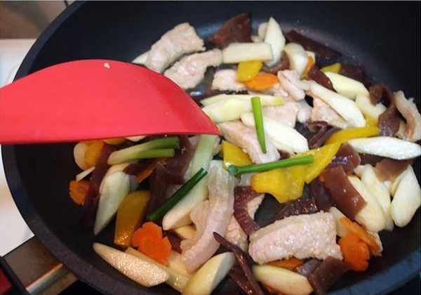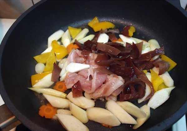 6.最后才放入比较快熟的木耳、肉片拌炒,并加入少许的盐调味。