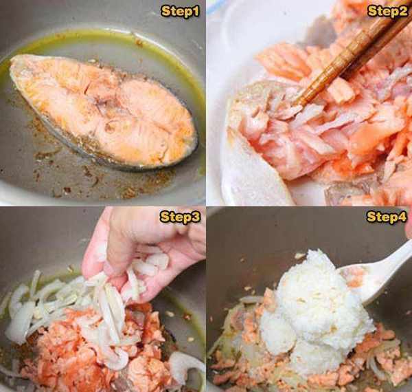 鲑鱼120g、洋葱丝20g、白饭100g、橄榄油4cc