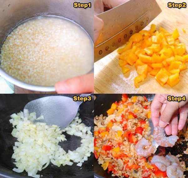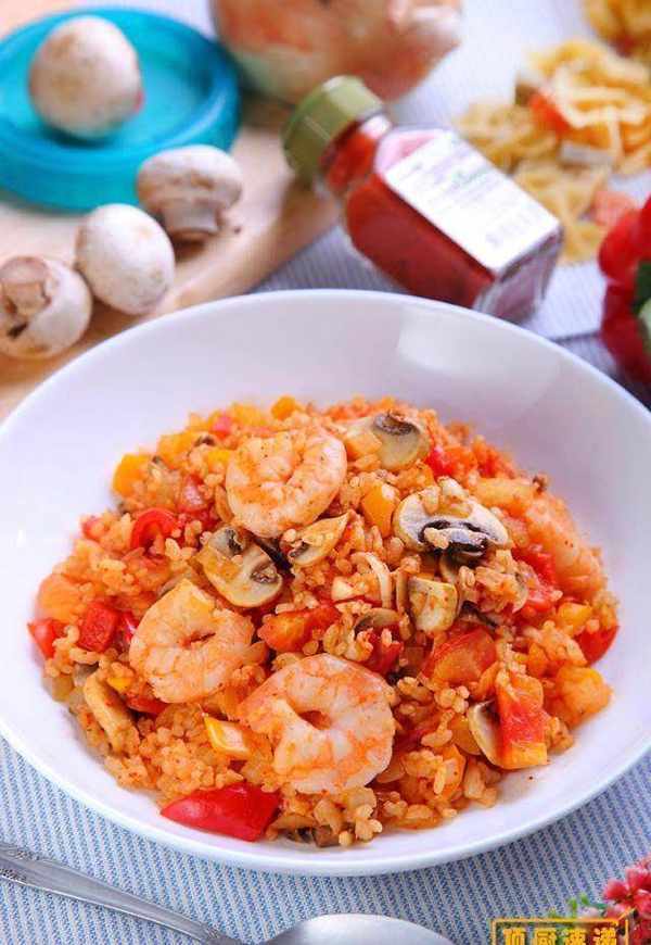 糙米40g、鲜虾80g、牛番茄100g、洋葱50g、黄椒25g、红椒25g、蘑菇25g、蒜头10g