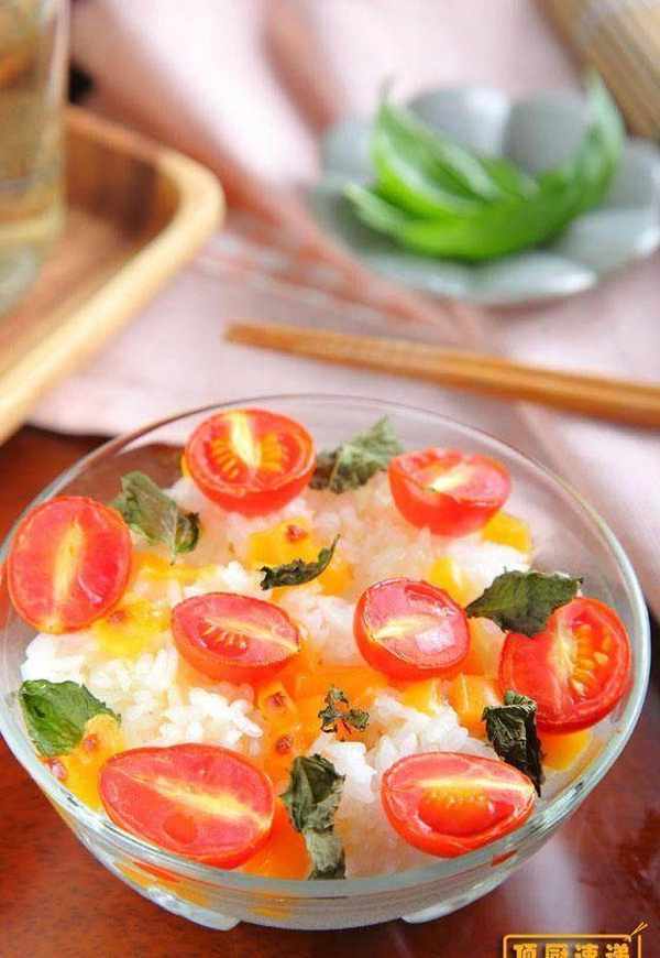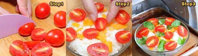 甜菊叶5片、小番茄4颗、起司8g、白饭100g、牛奶5cc、鲜奶油5cc
