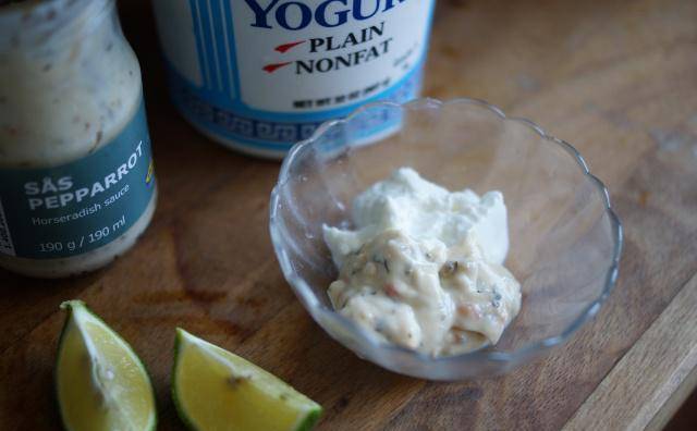 将辣根丝(我用辣根酱)、优格和半颗柠檬汁搅拌均匀备用。