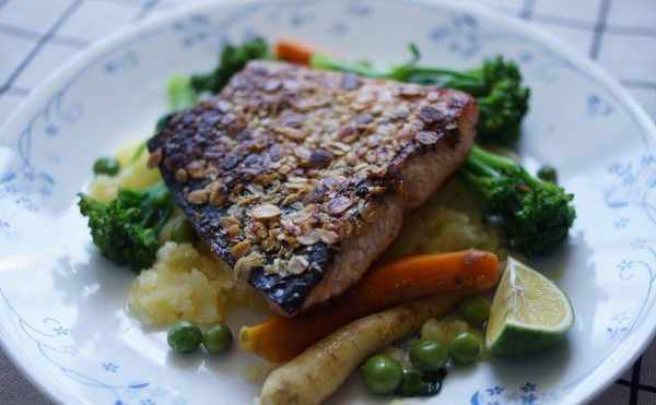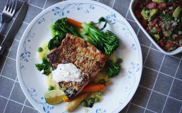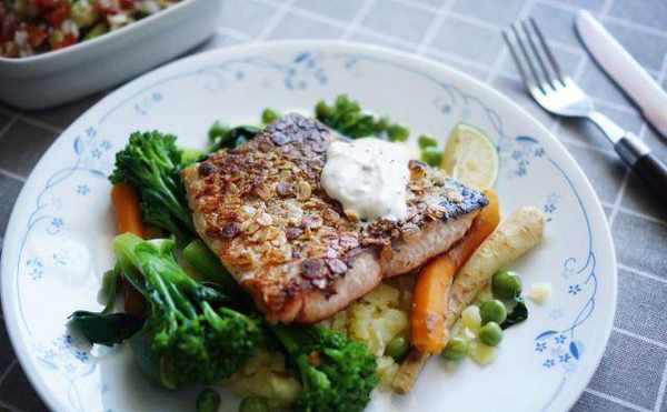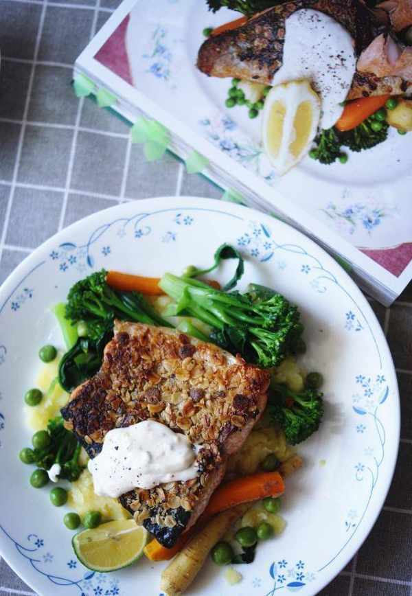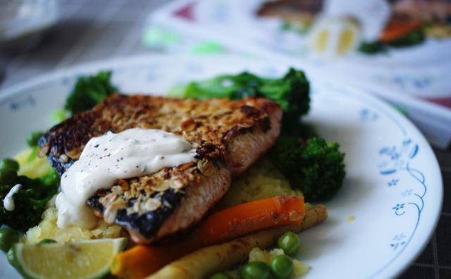 香煎鲑鱼、燕麦与百里香佐辣根优格马铃薯与绿蔬