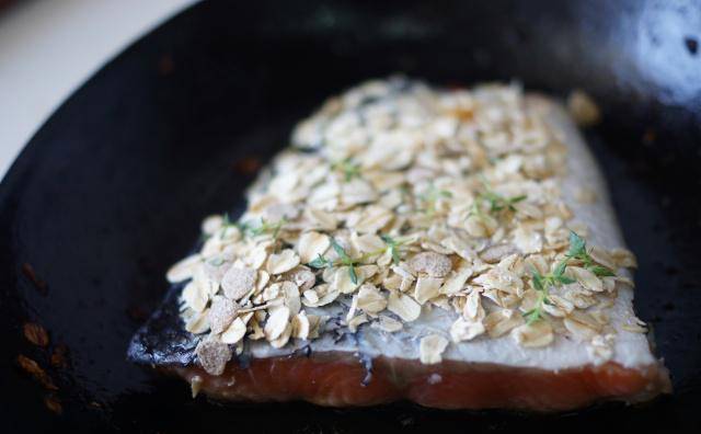 鱼皮朝上放入平底锅里,以中火煎2分钟,在鱼皮上撒百里香叶和燕麦片。