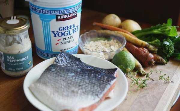 材料:小马铃薯、迷你胡萝卜、嫩茎青花菜、豌豆、辣根丝、原味优格、柠檬、鲑鱼(三文鱼)、橄榄油、新鲜百里香、煮粥用的燕麦片
