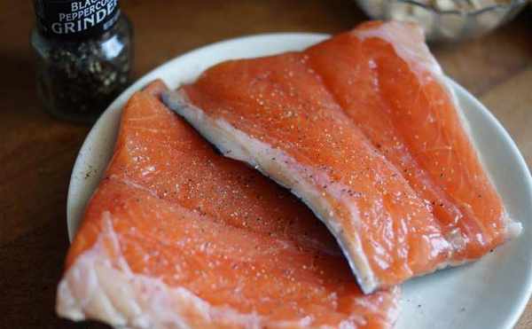 鳟鱼好像不容易买到,或许就在我眼前我也认不得,哈哈!所以一开始就打算要用鲑鱼代替,先抹上橄榄油、少许海盐和黑胡椒。
