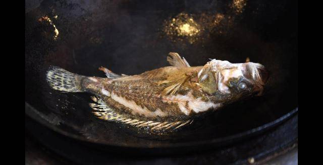 第三个必须留意的地方是,刚开始煎鱼时,油烧开后再关闭火,温度降到三成热,随后晃一晃锅,用滚油润一入锅,再开文火,将鱼入锅煎。当双面金黄色时,就好啦。