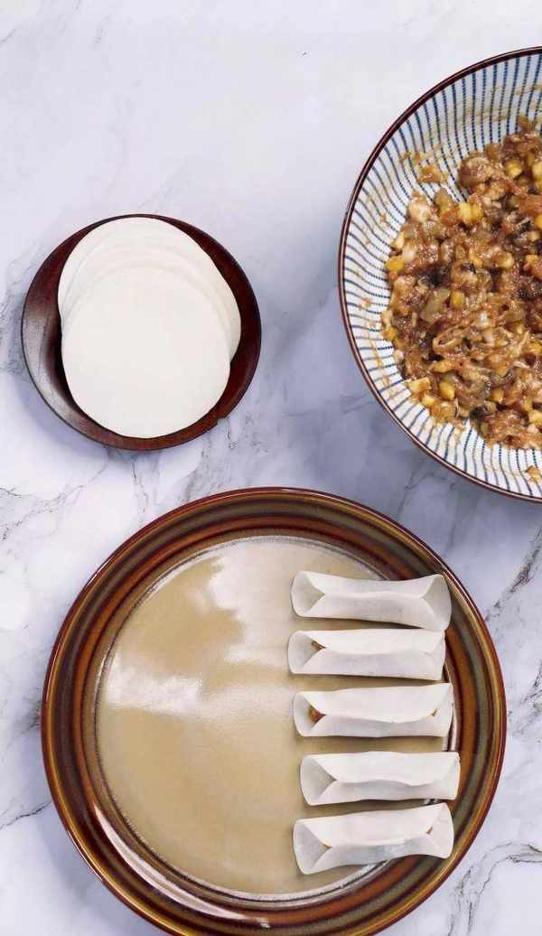 再加入生抽,老抽,香油,盐,蚝油,搅拌直至肉馅上劲,舀一勺肉馅放在饺子皮中间,边缘沾水,将饺子皮对折捏紧;