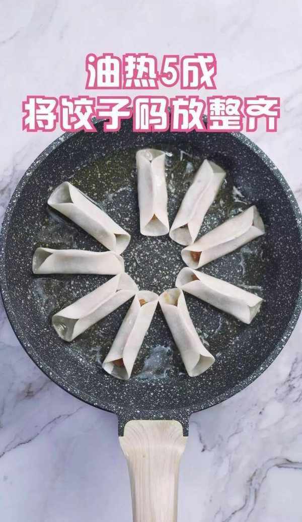 锅中刷少量油,油5成热时将饺子码放整齐,小火慢煎定型;