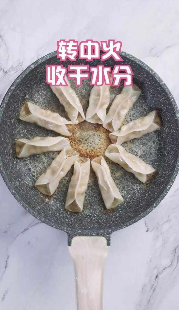饺子底部煎至金黄色,基本定型后倒入水淀粉,没过饺子底部即可,盖上锅盖,中火煮1分钟,转小火煮6分钟左右把淀粉烧干,这个过程要注意观察,避免糊底,如果没干再开盖转中火收干水分;