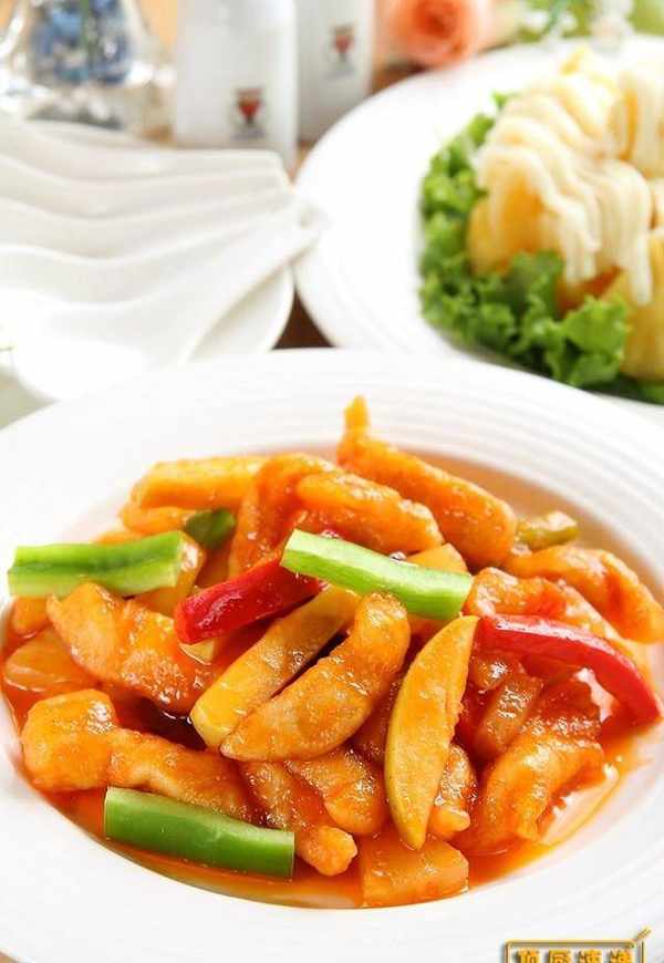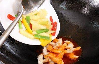 以小火另起油锅,放入佐酱,再放入鸡肉条均匀搅拌约2分钟,放水果以及彩椒炒约1分钟即可起锅。