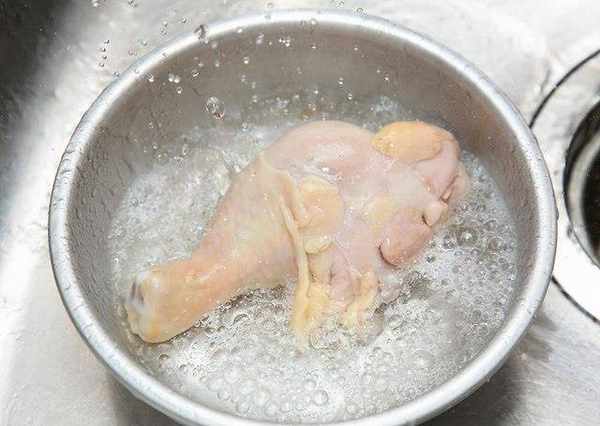 煮一锅水,将鸡腿放入锅中汆烫至变白,再冲冷水冷却。