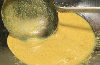 炒锅中放油,将绿咖喱酱炒至散发出香气后,再加入椰浆。