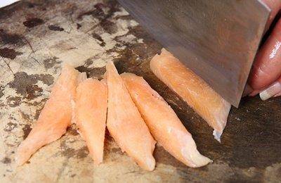 将鸡肉切成宽约1公分条状。彩椒、苹果洗净切条备用。
