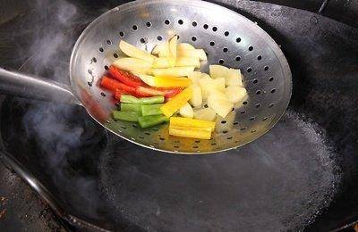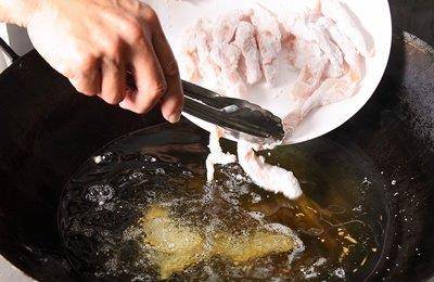 油量约锅子的一半,热油锅至摄氏150度,将鸡肉均匀裹上太白粉,再放入油锅中炸约1分钟捞起。