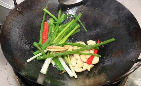 葱、辣椒洗净后切段,2匙油热油锅,放入大蒜、姜片、葱以及辣椒爆香。