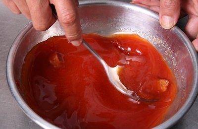 将话梅水、白砂糖、白醋以及番茄酱放入碗中混合成佐酱备用。
