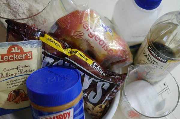 食材:(旧照)中筋面粉,鲜奶,砂糖,花生酱,泡打粉,香草精,香蕉(当然要有~!)