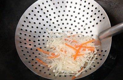 豆干从中央对剖,再将薄片状的卤豆干切成细丝。金针菇切除根部后洗净,用手逐一剥开,再切成长约5公分段状,榨菜泡水3分钟洗去表面杂质与适度去咸,葱和韭黄同样切成长约5公分段状。红萝卜切细丝。