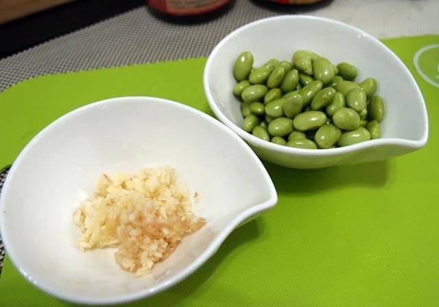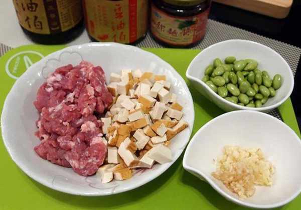 梅花猪绞肉300g、豆干六片、毛豆适量、大蒜两瓣、姜少许