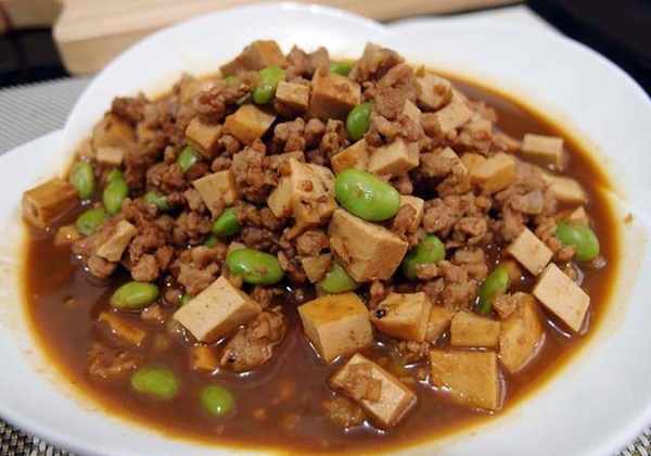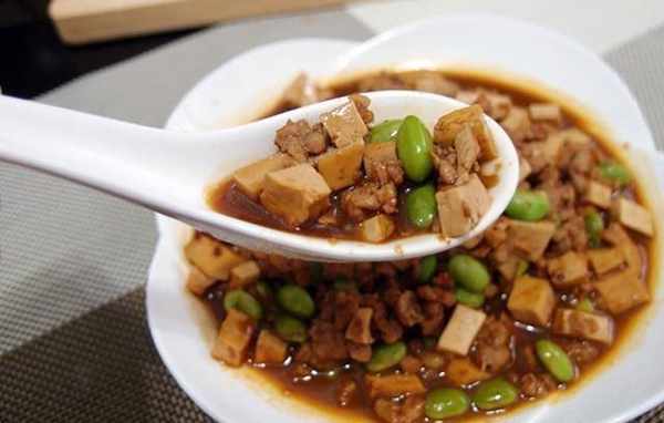 5.接着放入豆干小火煮五分钟,之后放入毛豆,等毛豆熟了,汤汁也收得差不多了,即可盛盘。