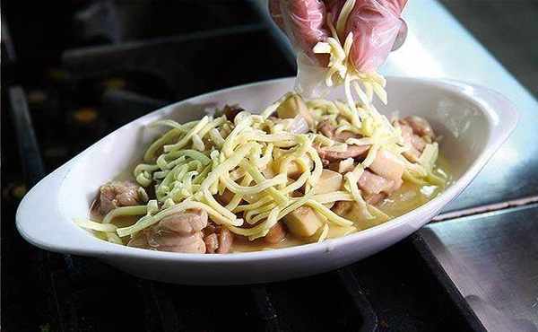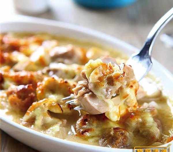 鸡肉裹附奶油、起司的香气,滑嫩味足。【野菇焗鸡肉】材料:鸡胸肉300克、杏鲍菇丁50克、洋葱丁40克、奶油30克,盐、胡椒、白酒、太白粉、起司丝各适量。准备:肉切丁。烤箱以160度预热10分,菇炒熟备用。