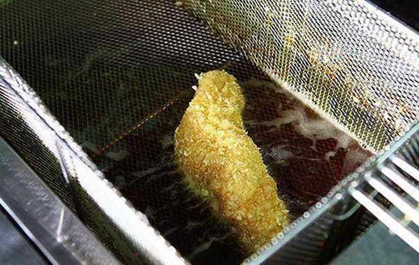 Step2.油炸:肉卷裹做法1,依序沾面粉、蛋液、面包粉,以160度油温炸熟。Tips:避免高温烹调肉质不干硬!「九层塔和柠檬片入锅后,可立即熄火,利用余温带出柠檬香与九层塔香,避免过热造成柠檬变苦。鸡肉在烤箱烤熟时,出炉前转大火让表层带点焦香,味道更棒。」