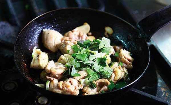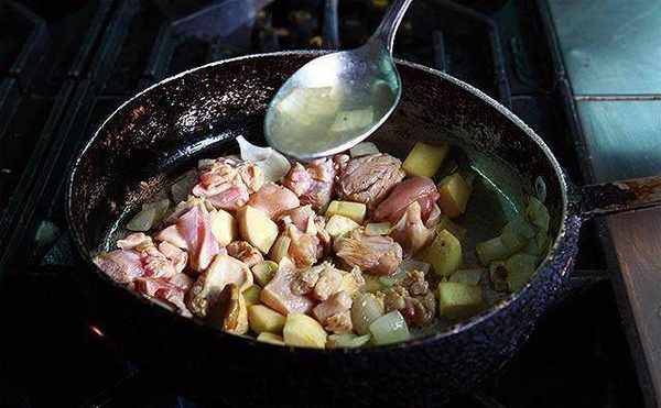 Step1.爆香:蒜碎爆香,鸡胸肉炒熟,盐、胡椒调味,加白酒烧收汁。