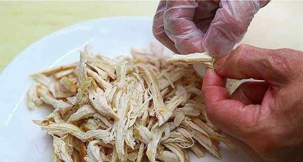 Step1.剥丝:鸡胸肉煎上色后,进烤箱以160度烤7分钟,取出,剥丝。