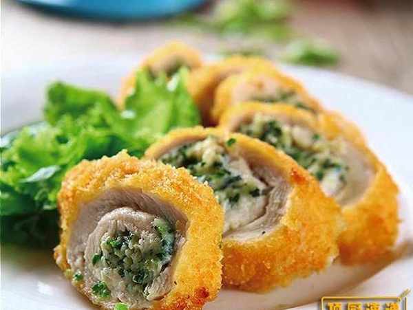 鸡肉包肉馅,再裹粉酥炸,口感层次十足。【炸鸡肉卷】材料:鸡胸肉300克、菠菜20克、蛋1颗,盐、胡椒、面粉、面包粉各适量,保鲜膜1张。准备:菠菜烫熟切碎,取250克鸡肉切蝴蝶刀,铺保鲜膜,以肉锤拍薄。