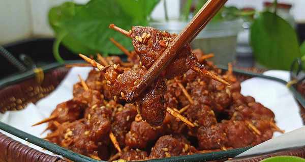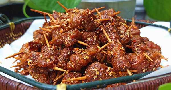 (1)鸡、猪、牛、羊肉都可以用来做牙签肉,但最好先切片,然后用刀背拍松,这样加工出来的肉才不会吃起来又干又粘。