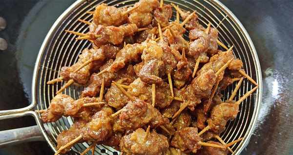 牙签肉是大人小孩都非常喜欢的美食。在正规的路边摊或一些熟食店随处可见。记得小时候,放学回家,每次看到大排档上的牙签肉,我都不敢去。妈妈每次买的时候,我都是边吃边吃,用一根小牙签夹在一起,肉外焦里嫩,一口咬下去很香。