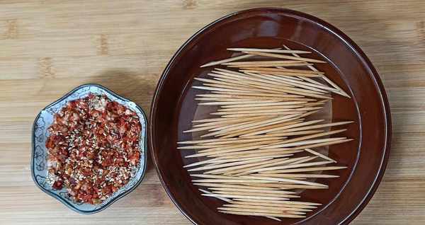 将准备好的牙签用开水浸泡,去除表面的灰尘。泡过的牙签不容易烫伤。