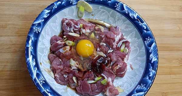 【步骤1】:瘦肉切成片,放入碗中,葱姜蒜切碎放入肉中,打入一个鸡蛋,加少许小苏打,生抽2勺,蚝油1勺,料酒,盐,取抓拌匀。