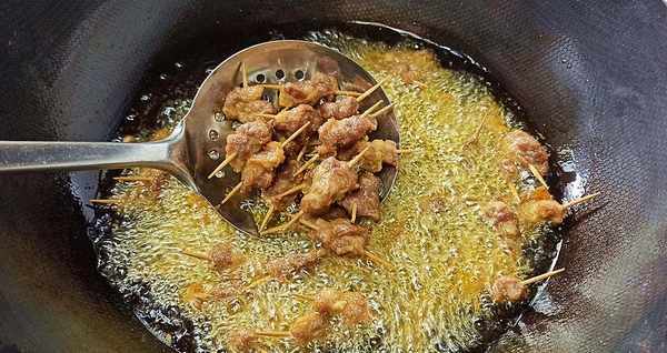 牙签肉上的油温一定要高一些。将肉放入锅中后,不要立即翻转。炸30秒后把肉摆好再翻动,不然肉片很容易脱落。