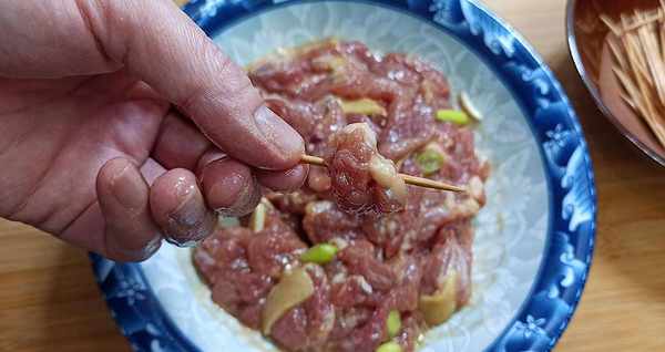 【第四步】:将腌好的肉用牙签一根一根穿好,装盘待用。