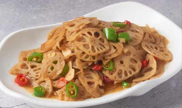 莲藕去皮后洗净,切成薄片,用水浸泡片刻,然后将小米、葱、姜、蒜切碎。锅内倒入油,烧热,加入小米、葱、姜、蒜炒香,下莲藕片,大火炒熟。烤好后加盐、鸡精、蚝油、生抽调味出锅。
