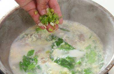 汤三度滚开时,将蛋液缓缓倒入高汤中。汤再次滚时,加入调味料,同时以汤勺搅拌,让调味料均匀散开。