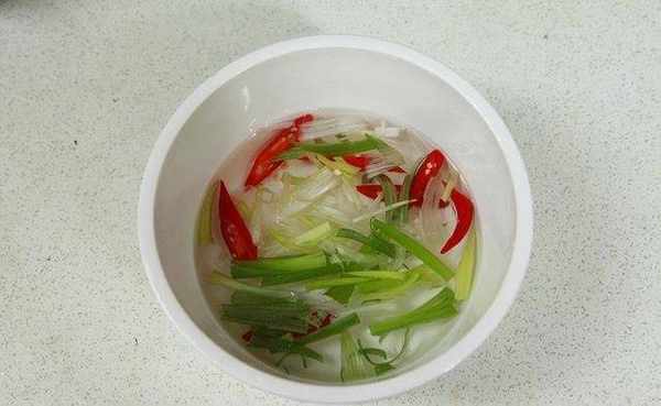 利用蒸煮的时间,将剩下的葱段、辣椒用刀背拍扁切丝,泡于冷水中备用。