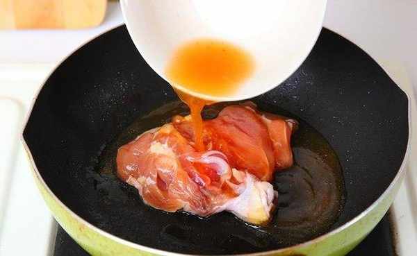 中火热油锅,将腌好的去骨鸡腿肉放入锅内。