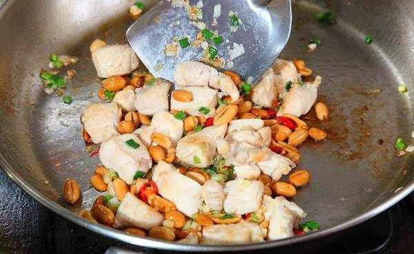 起一油锅,油温约摄氏160度,将鸡肉下锅煎至两面变白色,转小火,加盐、花生一起拌炒。