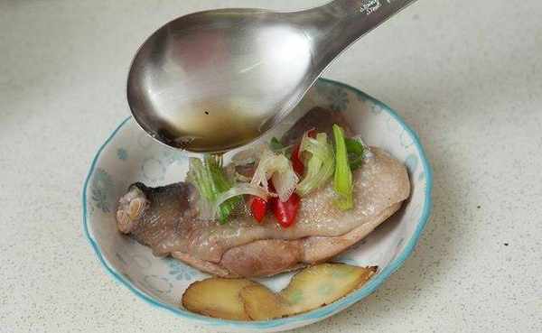 电锅跳起后取出鸡腿,将泡好冷水的葱段、辣椒置于鸡腿上。
