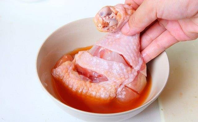 鸡腿洗净划刀痕,取出韩式泡菜,泡菜汁取大约100c.c.的量,先浸泡鸡腿肉半小时后泡菜汁便倒掉。