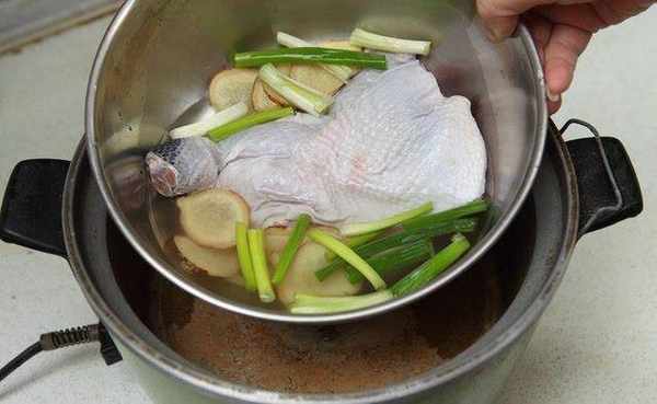 取内锅,放入去骨鸡腿、2/3分量的葱段、姜片、盐及米酒,并加入2米杯的水。接着于电锅外锅加1米杯的水,放入去骨鸡腿,按下开关蒸至跳起。