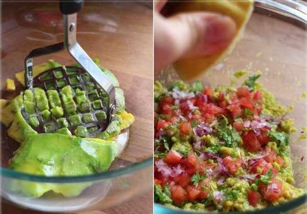 食谱里用调理机把酪梨打到滑顺,我喜欢有吃到酪梨的感觉,所以只用压泥器大略压一下,再混合其它切碎的材料,挤些柠檬汁用盐和黑胡椒略调味。
